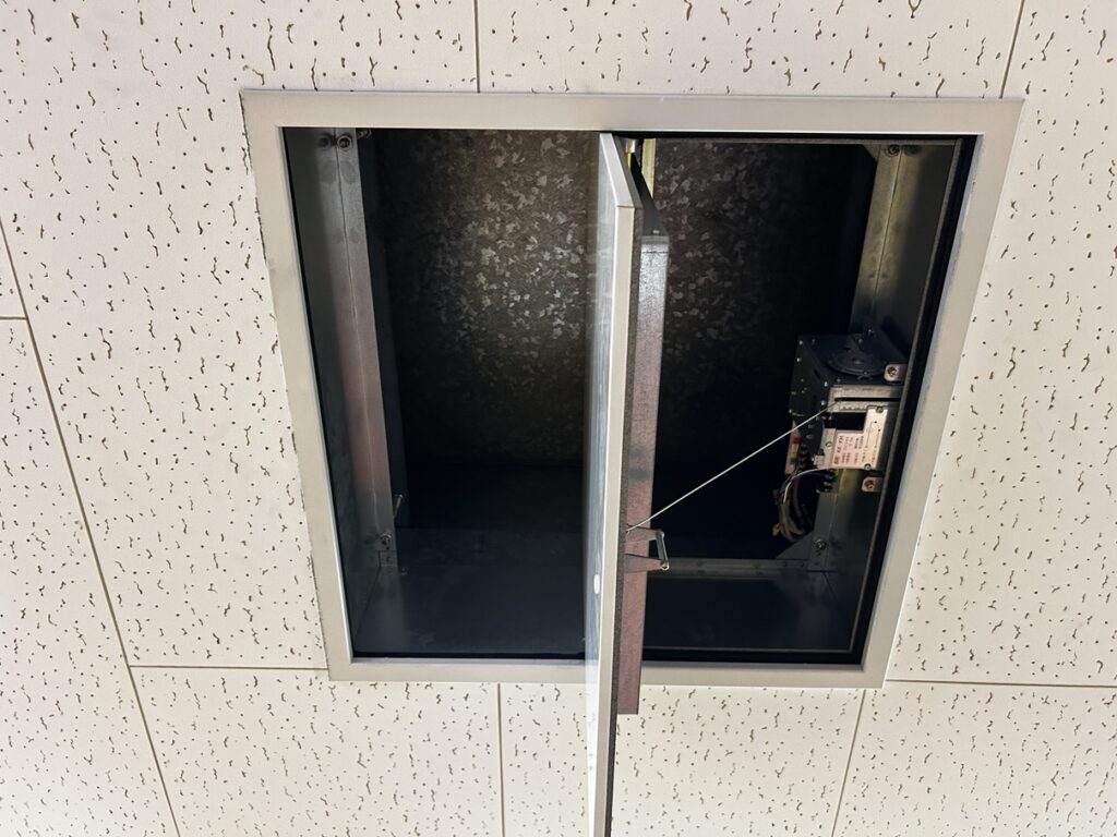 当社では、天井の排煙口から壁面の手動開放装置の修理を承っております。